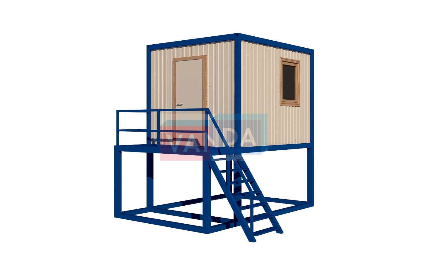 Пост охраны на подиуме №4 (вариант 1) изготавливается из несущего каркаса (верхняя и нижняя обвязка): швеллер 100х50х3 мм., угловые стойки: сложно - гнутый угол 90х90х3 мм., крыша блок-контейнера: металл сварной 0,9-1 мм., качественная наружная отделка: оцинкованный профлист, вспомогательный деревянный каркас (стены) выполнен из брусок 40х75 мм., лаги пола: обрезная доска 40х100 мм., лаги потолка: обрезная доска 40х100 мм., выполнено утепление: Минеральная вата «ISOVER» – 50 мм. и пароизоляция: плёнка техническая, черновой пол состоит из: обрезная доска 20 мм. (2 сорт), чистовой пол покрыт: ДСП строительное 16 мм., отделка пола выполнена из качественных материалов. Контейнер комплектуется окнами: деревянное, двойное остекление 800х1000, входной дверью: ДГ 21-8 обшита снаружи оцинкованным листом, врезной замок и внутренними дверями. Если в БК присутствуют перегородки, то для них используется: брусок 40х50 мм. Лестница постамента имеет перила, тетива лестницы выполнена из профтрубы 30х60 мм., ступени из уголка 25х25х3 мм., просечной лист, перила из профтрубы 20х40 мм., площадка перед входной дверью имеет ограждение.